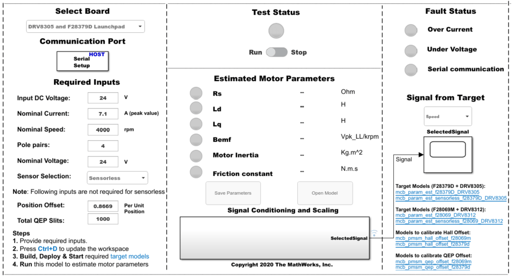 Инструменту оценки параметров требуется положение двигателя, определяемое либо квадратурным кодером, либо датчиком Холла, либо наблюдателем потока без датчика. Для правильного определения положения двигателя с помощью датчика положения необходимо откалибровать квадратурный кодировщик или датчик Холла, прикрепленный к тестируемому двигателю.