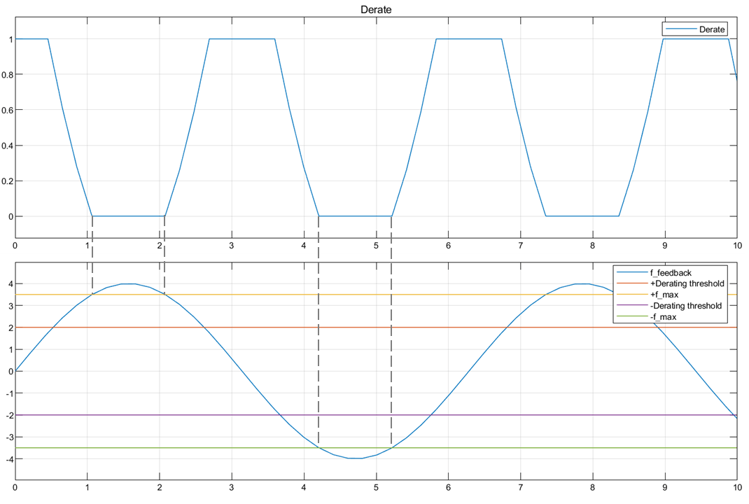 Блок Derating Function генерирует коэффициент снижения (y) в соответствии с отзывами (ffeedback) и максимальный предел (fmax) значения входного опорного сигнала.