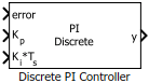 Блок дискретного PI контроллера выполняет вычисление дискретного PI контроллера с использованием сигнала ошибки и входов пропорционального и интегрального усиления. Сигнал ошибки представляет собой разность между опорным сигналом и измеренной обратной связью. Блок выводит взвешенную сумму входного сигнала ошибки и интеграла входного сигнала ошибки.