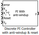 Контроллер дискретного PI с блоком защиты от намотки и сброса выполняет вычисление контроллера дискретного PI с использованием сигнала ошибки и входов пропорционального и интегрального усиления. Сигнал ошибки представляет собой разность между опорным сигналом и измеренной обратной связью. Блок выводит взвешенную сумму входного сигнала ошибки и интеграла входного сигнала ошибки.