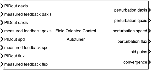 Блок Autotuner Field Oriented Control позволяет автоматически настраивать контуры управления PID в приложении field-oriented control (FOC) в режиме реального времени. Дополнительные сведения об управлении, ориентированном на поле, см. в разделе Управление, ориентированное на поле (FOC).