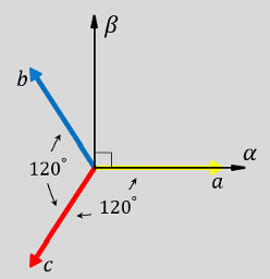 Направление эквивалентных выходных компонентов a, b и c в опорном кадре abc и опорном кадре αβ.