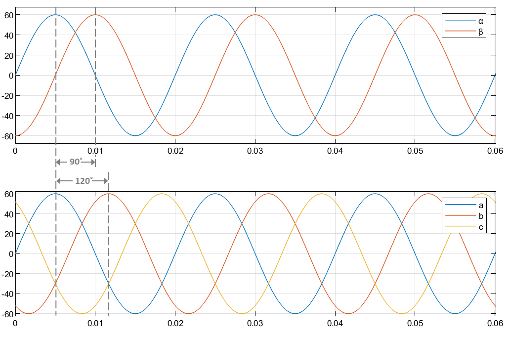 Блок принимает компоненты оси α-β в качестве входных и выводит соответствующие трехфазные сигналы, где ось фаза-a выравнивается с осью α.