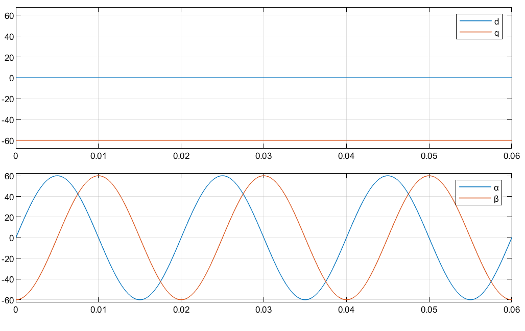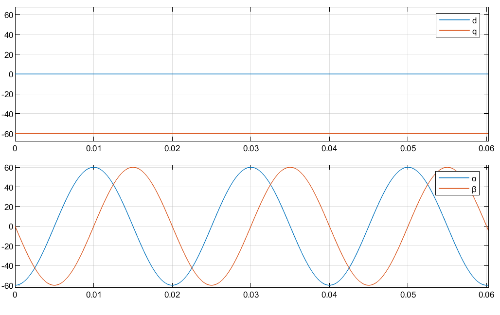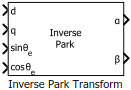 Блок обратного преобразования парков вычисляет обратное преобразование парков ортогональных компонентов прямой и квадратурной осей в вращающемся опорном кадре dq. Можно настроить блок для выравнивания оси d- или q с осью α в момент времени t = 0.