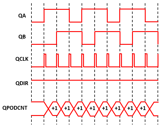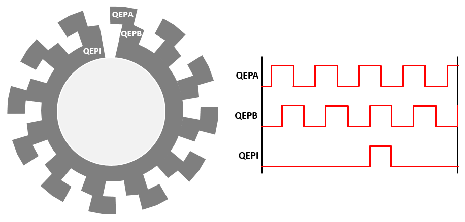 На этом рисунке показан диск квадратурного кодера с двумя каналами (QEPA и QEPB) и индексным импульсом (QEPI):