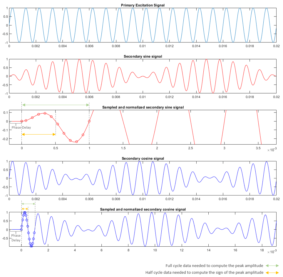 Блок вычисляет и выводит положение распознавателя в [0, 2δ] радианах. Блок может также добавлять фазовую задержку к дискретизированным синусоидальным и косинусным сигналам относительно сигнала возбуждения.