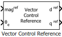 Блок принимает величину и положение опорного вектора в качестве входных данных. Блок выводит компоненты опорного вектора вдоль прямой и квадратурной осей вращающегося опорного кадра dq.