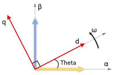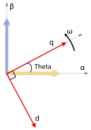 Тета - это угол между α- и d-осями для выравнивания d-оси или угол между α- и q-осями для выравнивания q-оси. Он указывает угловое положение вращающейся опорной рамки dq относительно α-оси.