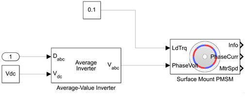 В модели Simulink ®, содержащей блок PMSM поверхностного монтажа, добавьте блок инвертора среднего значения из библиотеки Blockset™ управления двигателем. Блок инвертора среднего значения считывает нормализованный рабочий цикл ШИМ и вход постоянного напряжения (в вольтах) и выводит фазные напряжения. Подключите выходной порт Vabc блока инвертора среднего значения к входному порту PhaseVolt блока PMSM Surface Mount.