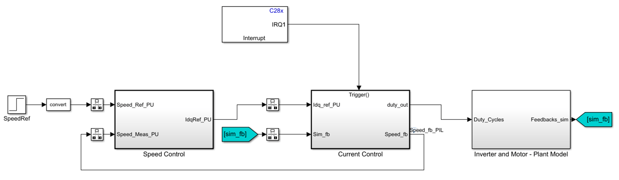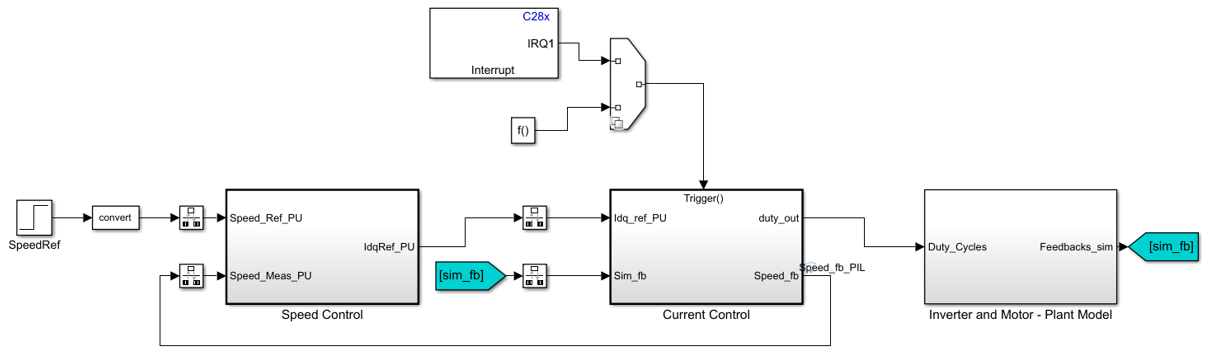 В текущей подсистеме управления добавьте блок Trigger и установите для параметра Trigger type значение function-call. Подключите вход триггера этой подсистемы к блоку аппаратных прерываний, как показано на этом рисунке.