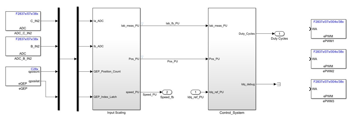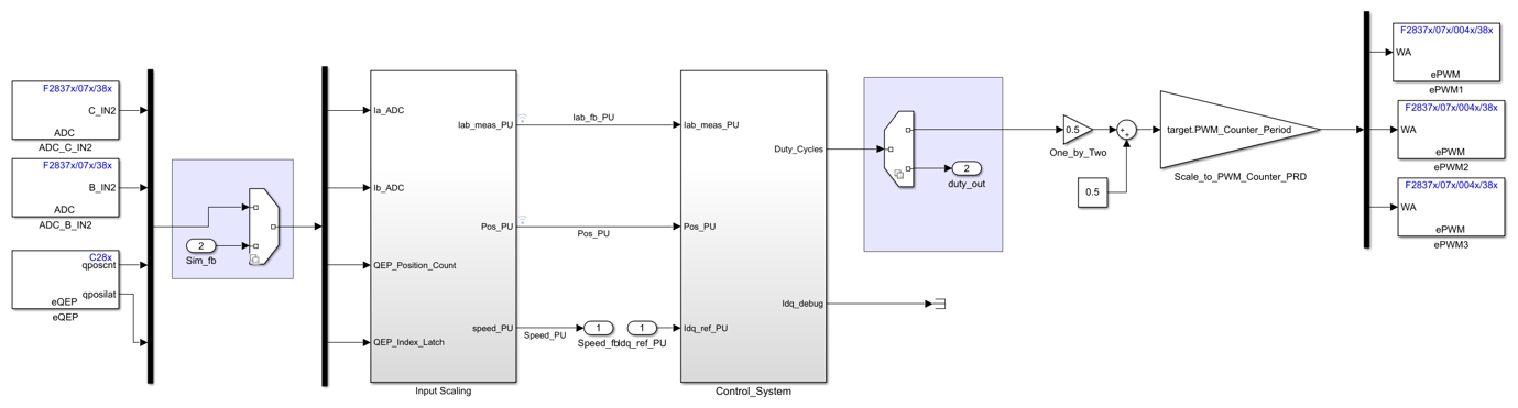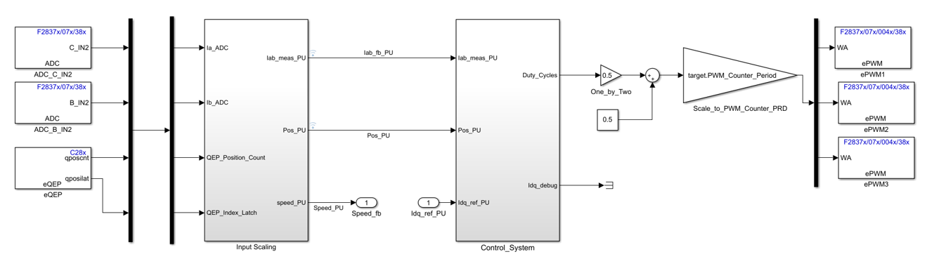 Блоки ePWM ожидают, что значение рабочего цикла будет находиться в диапазоне от 0 в регистр счетчика периодов (5000). Подсистема Control_System выводит ШИМ в диапазоне -1 кому 1. Эта модель масштабирует выходные данные до 0 кому 5000(значение счетчика периодов).