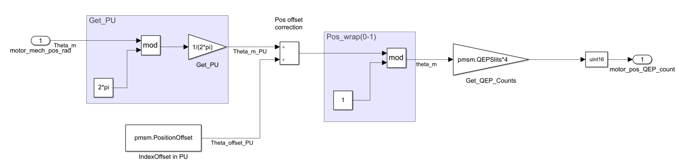 Подсистема определения положения считывает положение двигателя из блока PMSM поверхностного монтажа и имитирует счетчики импульсов кодера QEP. Блок PMSM поверхностного монтажа выводит механическое положение двигателя в рад/с.