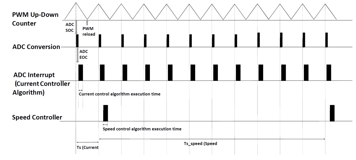 На этом рисунке время выполнения для текущего контроллера и контроллера скорости не в масштабе. Для лучшего понимания функциональных возможностей периферийных устройств процессора, таких как АЦП (аналого-цифровой преобразователь) и ШИМ (широтно-импульсная модуляция), см. техническое описание процессора.