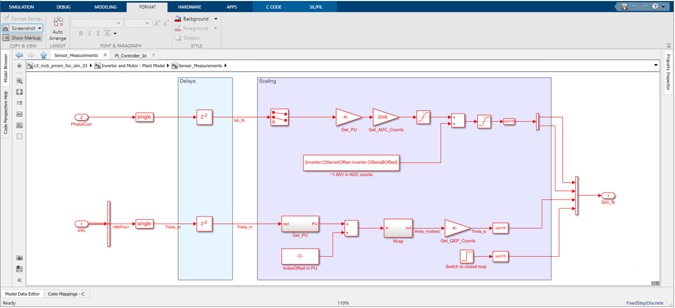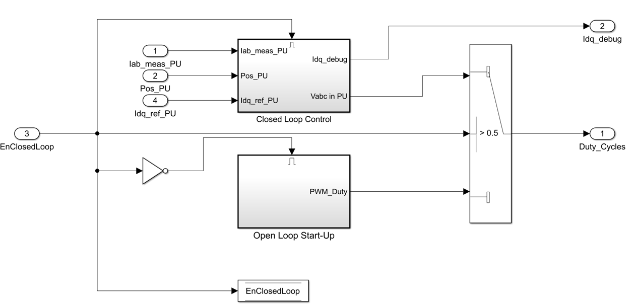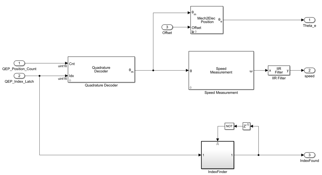 Копировать mcb_pmsm_foc_qep_f28379d/Current Control/Input Scaling/Calculate Position and Speed подсистему к модели. Это добавляет IndexFinder блок. При первом обнаружении импульса индекса квадратурного кодера IndexFound для порта установлено значение 1. Добавление выходного порта IndexFound и переименовать его в EnClosedLoop.