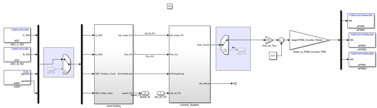 Копировать mcb_pmsm_foc_qep_f28379d/Current Control/Control_system подсистему к модели. Это добавляет логику для запуска двигателя с разомкнутым контуром. Эта подсистема переключает управление с разомкнутого контура на замкнутый, если вход EnTLoop 1. Добавьте входной порт EnTalkLoop. При этом добавляются блоки чтения хранилища данных для Enable и SpeedRef. Добавьте блоки памяти Data Store Enable, EnForcedLoop и SpeedRef на самом верхнем уровне модели.