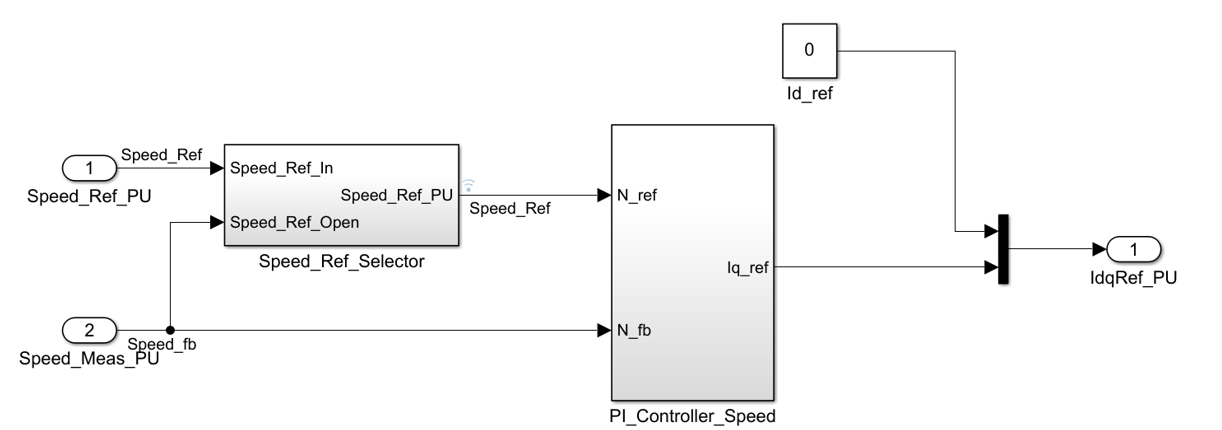 Копировать mcb_pmsm_foc_qep_f28379d/Speed Control/Speed_Ref_Selector подсистему к модели. Этот блок использует speed_ref блокируется при начале управления по замкнутому контуру. Для плавного перехода от разомкнутого контура к замкнутому контуру измеренная скорость используется в качестве эталона скорости во время разомкнутого цикла. Добавьте блок записи в хранилище данных SpeedRef в PI_Controller_Speed входной порт.