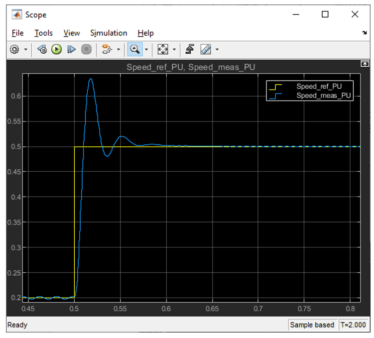 Чтобы вручную настроить подсистему контроллера скорости, добавьте ввод шага (в диапазоне 0.2 кому 0.5 PU) на вход Speed_ref_PU в подсистеме контроллера скорости. Проконтролируйте отклик на шаг скорости и настройте параметры подсистемы контроллера скорости. На этом рисунке показана ступенчатая реакция контроллера скорости.