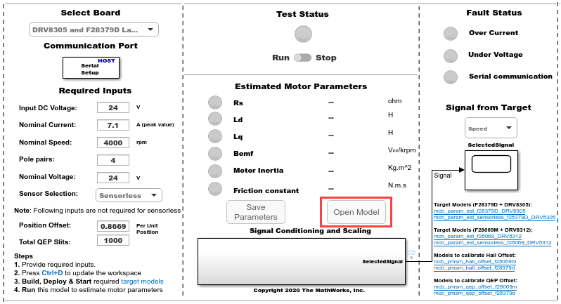 Процесс оценки параметров блока управления двигателем помогает определить параметры двигателя путем выполнения ряда тестов на двигателе. Дополнительные сведения см. в разделе Оценка параметров двигателя с помощью инструмента оценки параметров блока управления двигателем. После успешной оценки параметров двигателя щелкните Открыть модель (Open Model) в главной модели оценки параметров. Откроется новая модель с блоком Interior PMSM, обновленным оценочными параметрами двигателя.