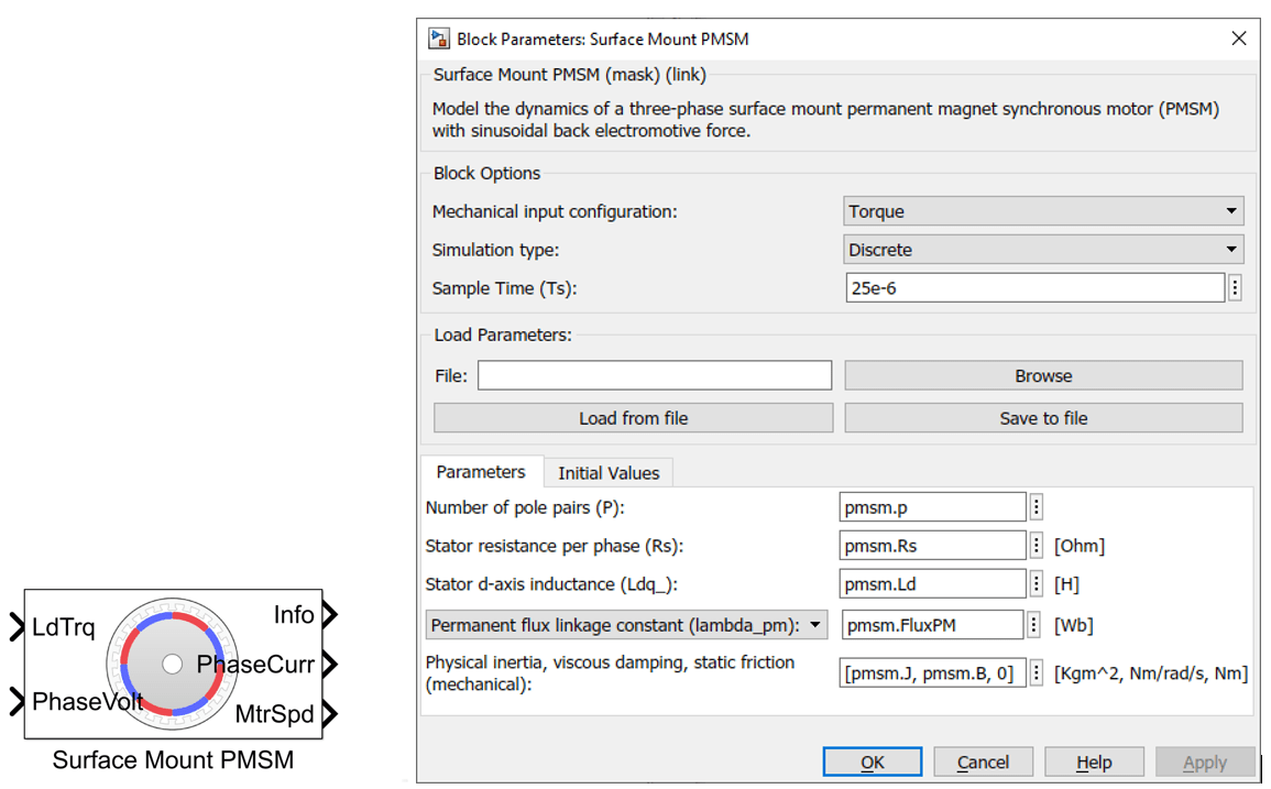Создайте новую модель Simulink и добавьте блок PMSM поверхностного монтирования из библиотеки блоков управления двигателем в браузере библиотеки Simulink. Откройте маску блока и введите параметры двигателя вручную. Эти параметры можно получить с помощью: