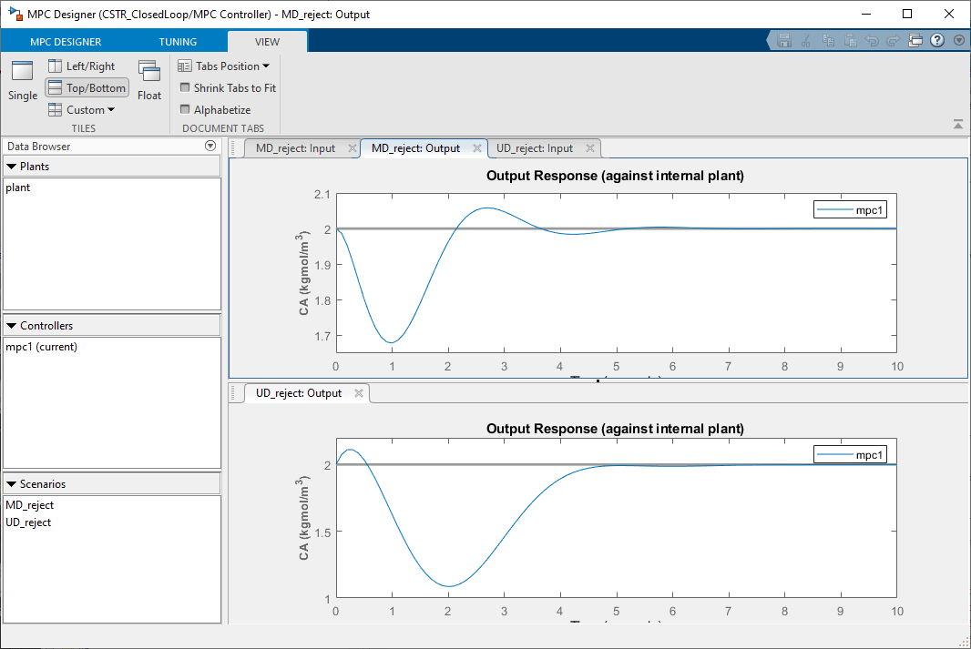 Выходной отклик аналогичен MD_reject отклику от моделирования MPC Designer.