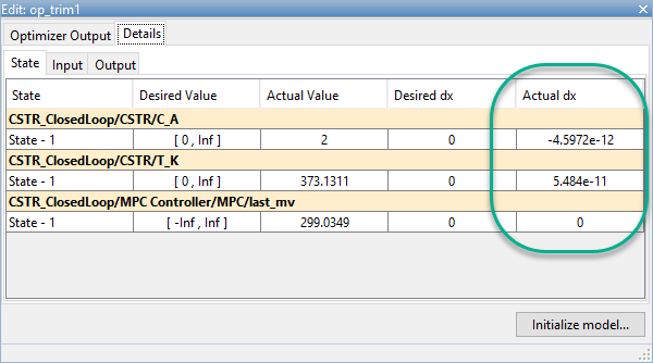 Чтобы задать начальные состояния модели Simulink для значений рабочих точек в столбце Фактические значения (Actual Values), щелкните Инициализировать модель (Initialize model). Это позволяет в дальнейшем моделировать модель Simulink в вычисленной рабочей точке, а не в исходных условиях модели по умолчанию.