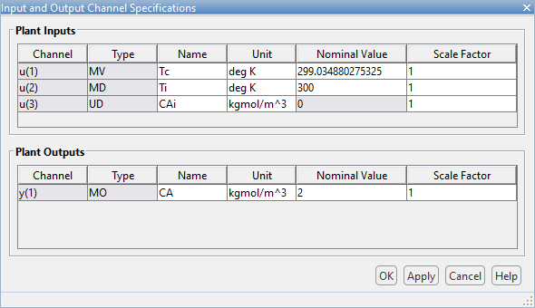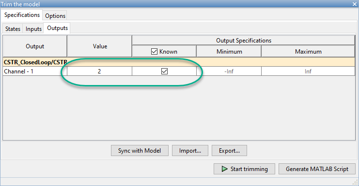 В этом примере линеаризация модели Simulink выполняется в установившейся рабочей точке равновесия, где остаточная концентрация составляет 2 кгмоль/м3. Чтобы вычислить такую рабочую точку, добавьте CA сигнал в качестве выходного ограничения обрезки и укажите его целевое значение ограничения.