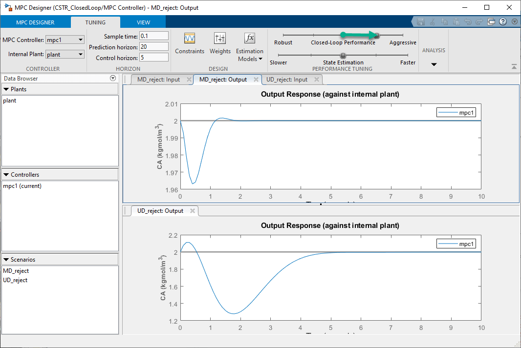 В разделе «Настройка производительности» перетащите ползунок «Производительность замкнутого цикла» вправо, что приводит к более жесткому управлению выходами и более агрессивным перемещениям управления. Перетащите ползунок до тех пор, пока ответ MD_reject: Output не достигнет устойчивого состояния менее чем за две секунды.