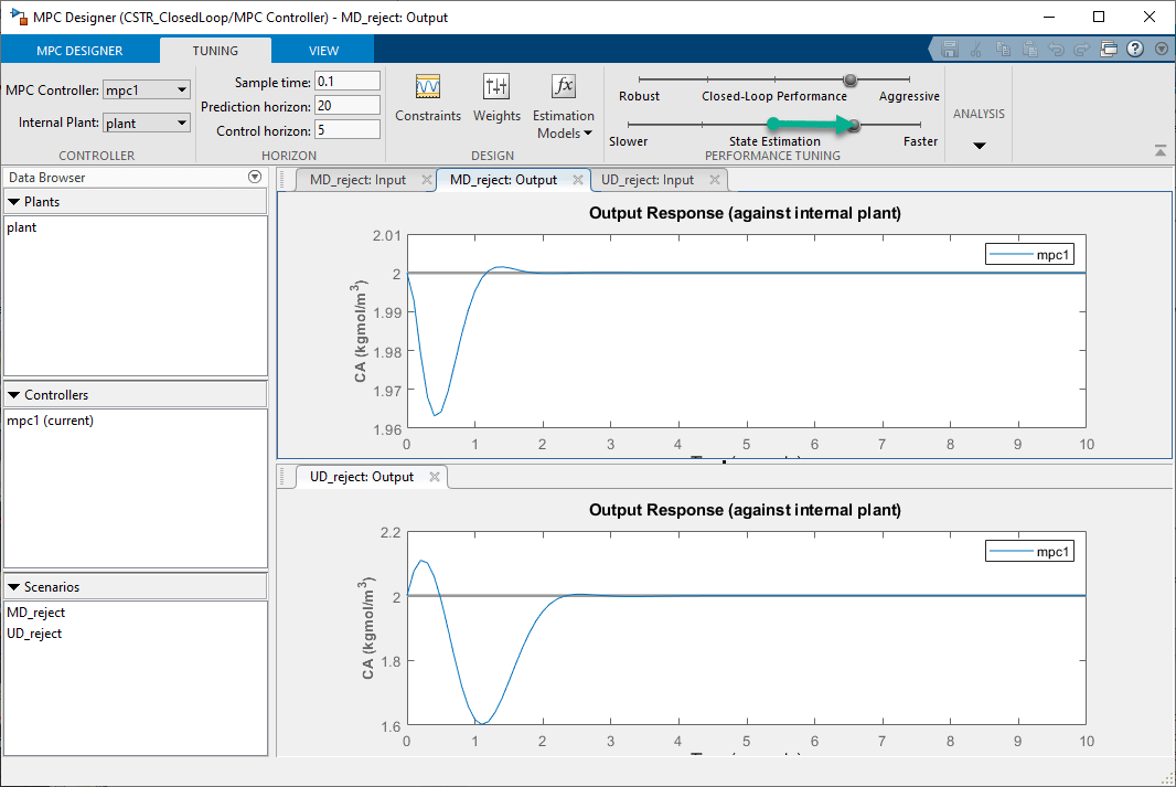 Перетащите ползунок «Оценка состояния» вправо, что приводит к более агрессивному отклонению неизмеренного нарушения. Перетащите ползунок до тех пор, пока ответ UD_reject: Output не достигнет устойчивого состояния менее чем за 3 секунды.