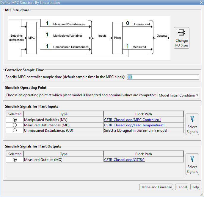 В диалоговом окне Определить структуру MPC по линеаризации (Define MPC Structure By Linearization) выполните линеаризацию модели, щелкнув Определить и линеаризировать (Define and Linearize).