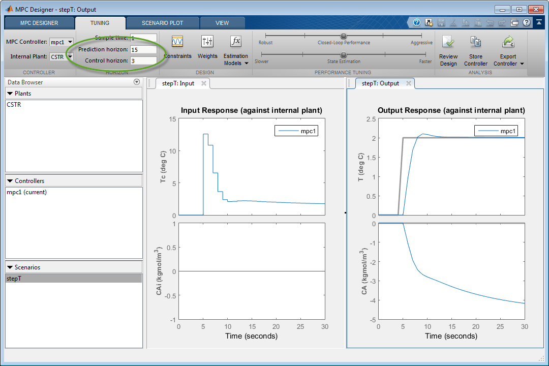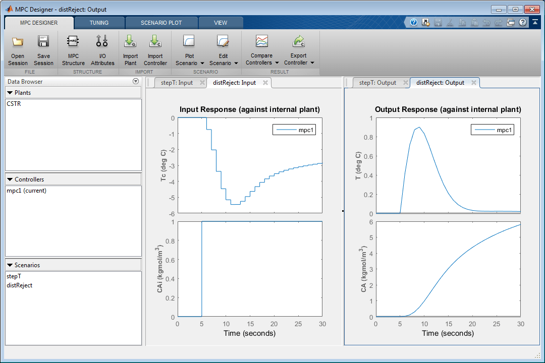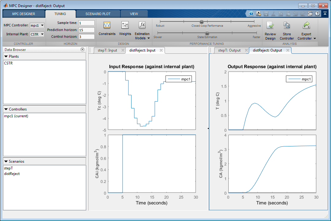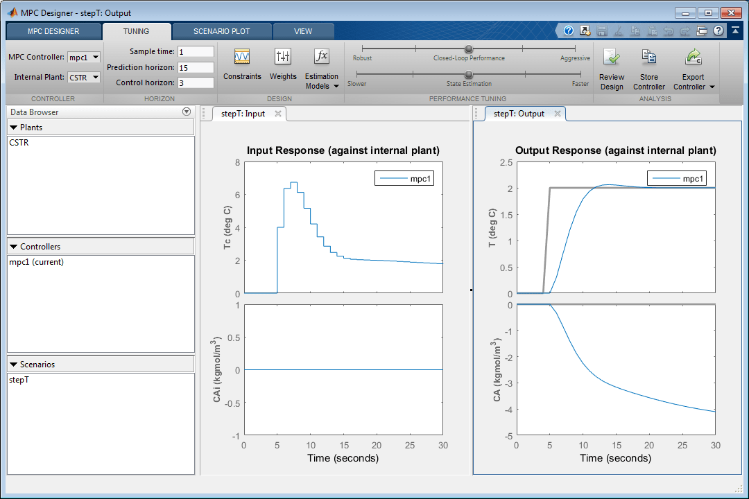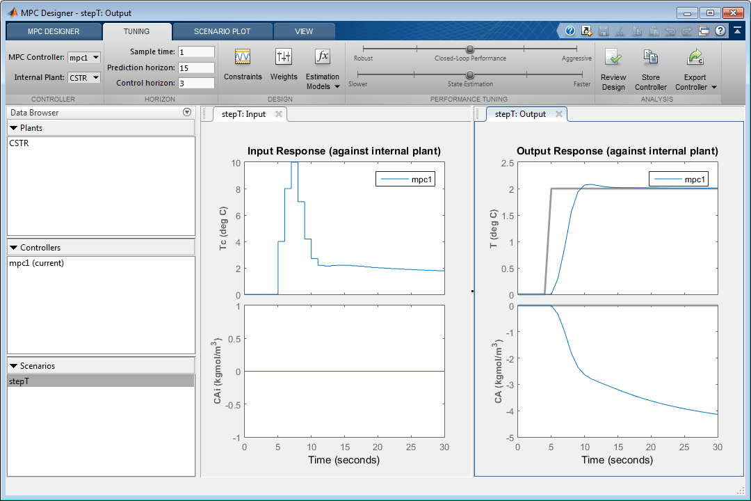 На графиках реакции на выходе, как только концентрация СА в реакторе приближается к 3 кгмоль/м3, температура в реакторе, Т, начинает увеличиваться. Поскольку существует только одна управляемая переменная, контроллер делает компромисс между двумя конкурирующими целями управления: контроль температуры и удовлетворение ограничений. Более мягкое ограничение выхода позволяет контроллеру больше жертвовать требованием ограничения для достижения улучшенного отслеживания температуры.