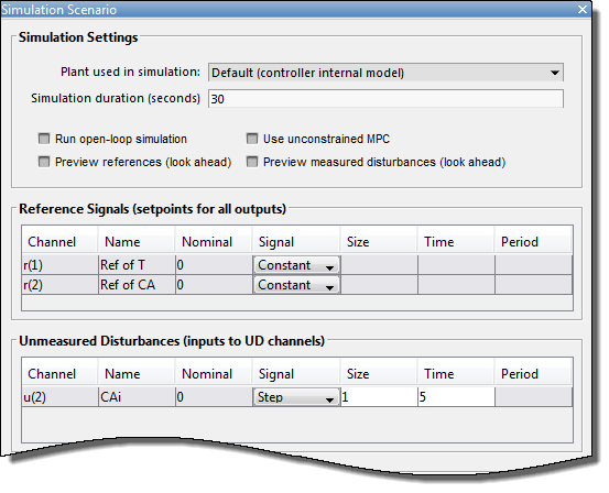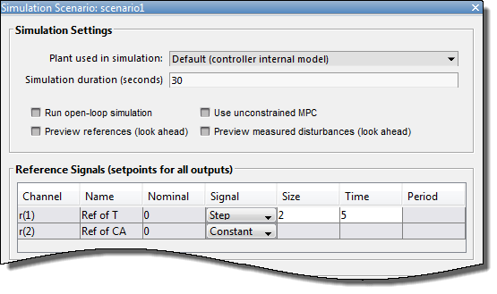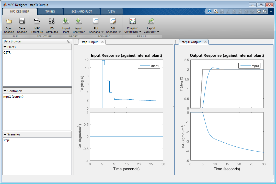 Сценарий по умолчанию настроен для моделирования изменения шага 2 градусов в температуре реактора, Т, в момент времени 5 секунд.