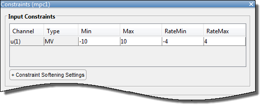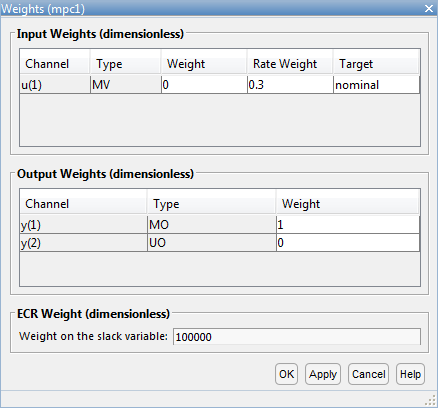 В таблице Входные веса (Input Weights) увеличьте вес регулируемой переменной (MV) до 0.3. Увеличение веса ставки СН штрафует за большие изменения СН в функции оптимизации затрат контроллера.