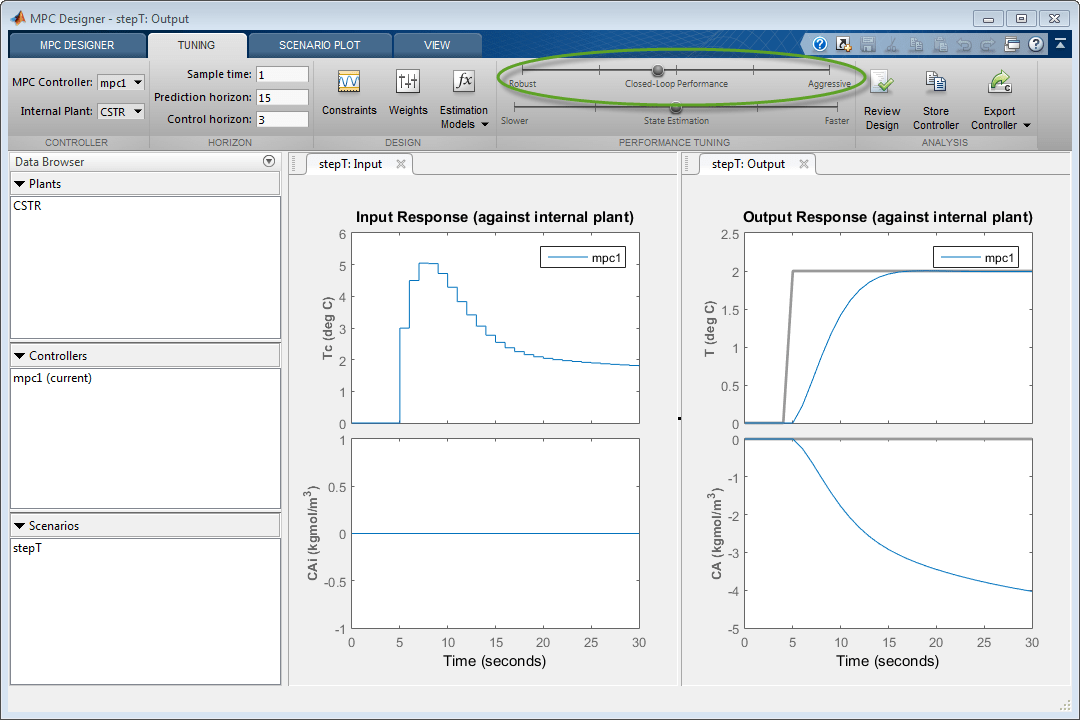 Предположим, приложение требует нулевого превышения в выходном ответе. На вкладке «Настройка производительности» перетащите ползунок «Производительность по замкнутому циклу» влево до тех пор, пока ответ на вывод не будет переполнен. Перемещение этого ползуна влево одновременно увеличивает управляемый вес переменной скорости контроллера и уменьшает выходной вес переменной, создавая более надежный контроллер.
