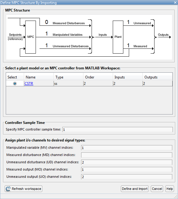 В диалоговом окне Определение структуры MPC путем импорта в таблице Выбор модели завода или контроллера MPC выберите CSTR модель.