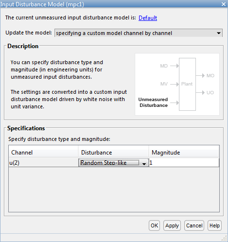 Когда модель установки включает в себя неизмеренные входы возмущений (UD), контроллер может использовать входную модель возмущений в дополнение к стандартной модели возмущений на выходе. Первый обеспечивает большую гибкость и создается автоматически по умолчанию. Если выбранная модель входного возмущения не позволяет полностью устранить устойчивые возмущения, модель выходного возмущения также добавляется по умолчанию.