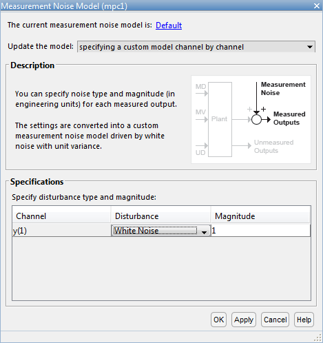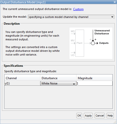 С помощью MPC Designer можно указать тип шума, который должен повлиять на OV каждого завода. В приложении на вкладке Настройка в разделе Дизайн щелкните Модели оценки > Модель нарушения вывода. В диалоговом окне Выходная модель возмущения в раскрывающемся списке Обновить модель выберите указание пользовательского канала модели по каналам.