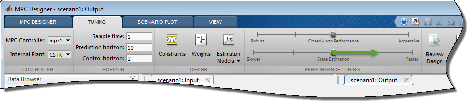 В MPC Designer на вкладке «Настройка» перетащите ползунок «Оценка состояния» вправо. Переход к более быстрой оценке состояния одновременно увеличивает коэффициенты усиления для моделей возмущений и уменьшает коэффициенты усиления для моделей шума.