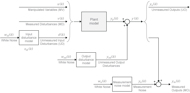 Дополнительный белый шум wu (k) и wv (k) с одинаковыми характеристиками добавляет к безразмерным входам u (k) и v (k) соответственно. Это повышает производительность оценщика в определенных случаях, например, когда модель установки является нестабильной с разомкнутым контуром.