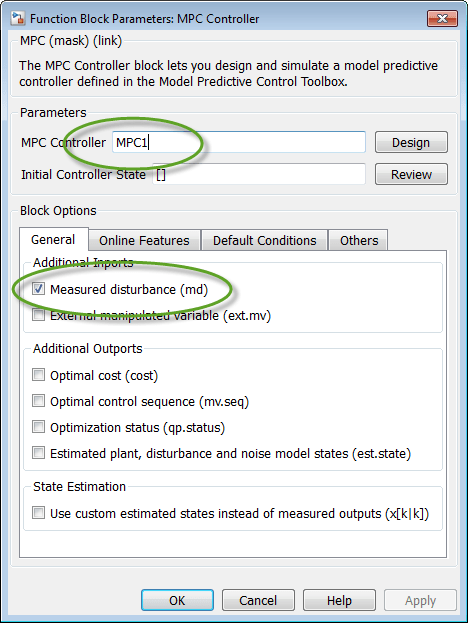 Блок контроллера MPC уже настроен для использования MPC1 контроллер, ранее экспортированный в рабочую область MATLAB.