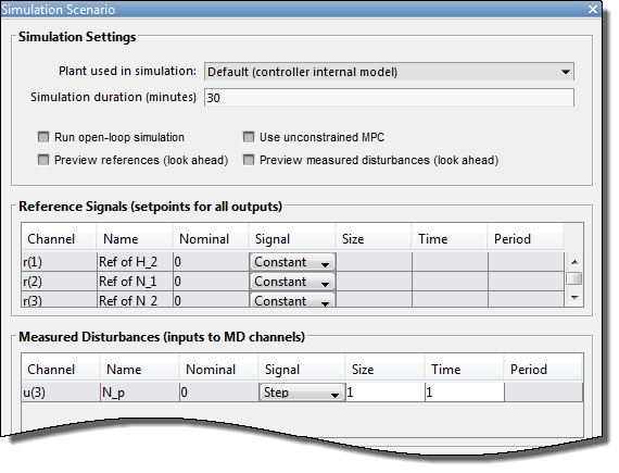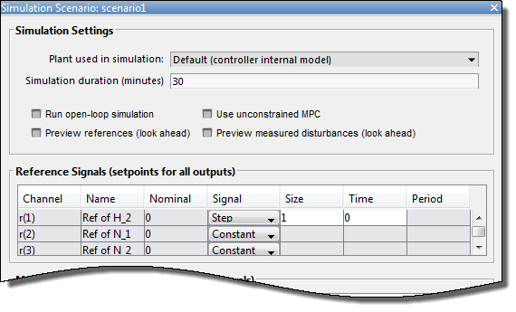 В диалоговом окне «Сценарий моделирования» в таблице «Измеренные возмущения» в раскрывающемся списке «Сигнал» выберите Constant для устранения измеренного возмущения.
