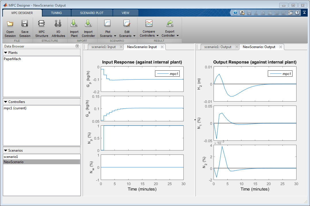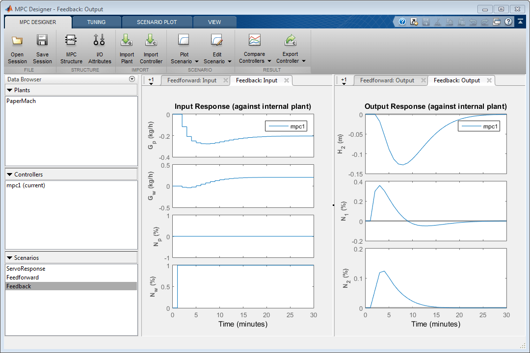 Контроллер уделяет больше внимания устранению ошибок в консистенции питающего резервуара, N2, что значительно снижает максимальную абсолютную погрешность. Компромисс представляет собой более длительное время отклика около 17 минут для уровня в питательном резервуаре, H2.