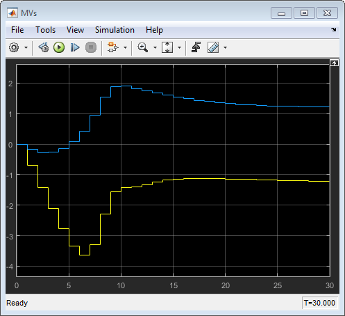 Манипулируемые переменные начинают изменяться до того, как происходит измеренное возмущение, потому что контроллер использует известное значение будущего возмущения при вычислении своего управляющего действия. Значения выходного возмущения также начинают изменяться до возникновения возмущения, что уменьшает величину выходных ошибок. Однако существенного улучшения по сравнению с предыдущим результатом моделирования не наблюдается.