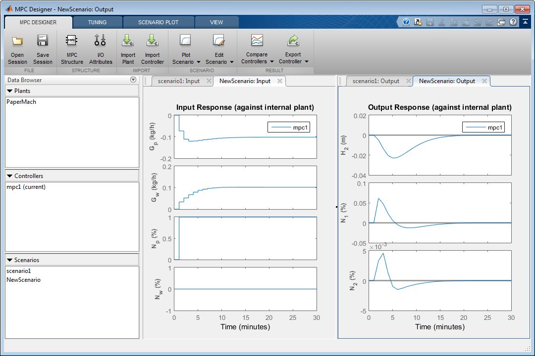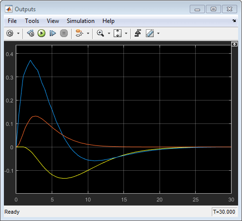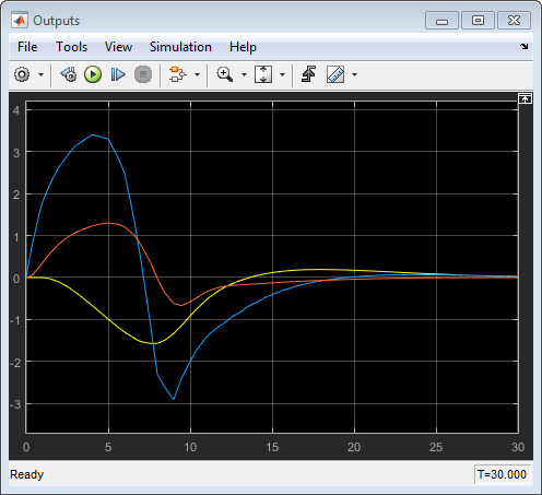 На графике «Выходы» ответы почти идентичны ответам от соответствующего моделирования в MPC Designer. Желтая кривая - H2, синяя - N1, красная - N2.
