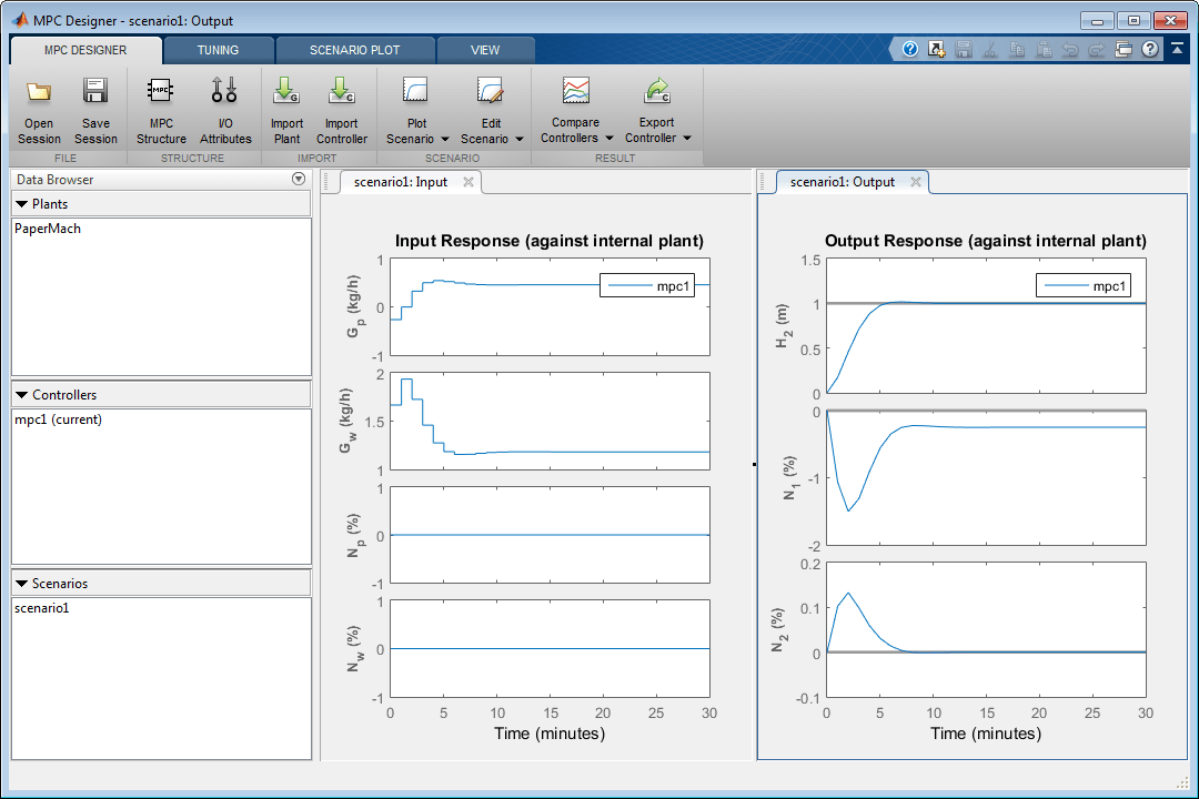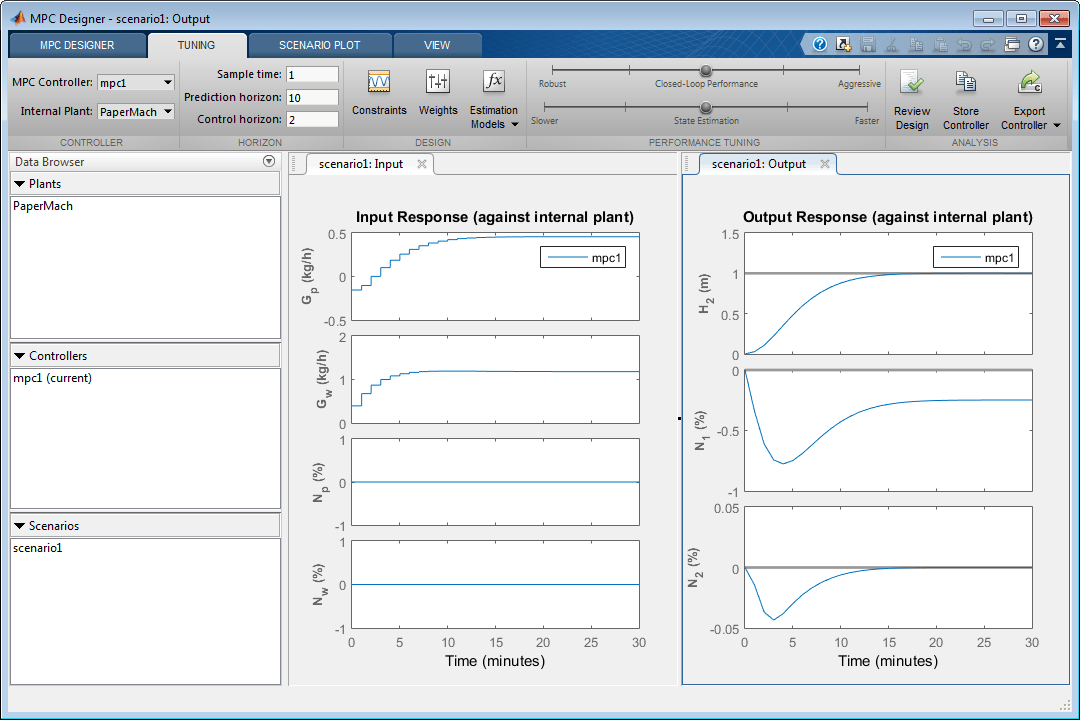 Первоначальная конструкция использует консервативные усилия управления для создания надежного контроллера. Время отклика для выходного H2 составляет около 7 минут. Чтобы сократить это время отклика, можно уменьшить время выборки, уменьшить веса манипулируемой переменной скорости или уменьшить ограничения манипулируемой переменной скорости.