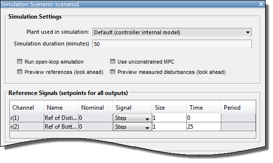 В таблице Опорные сигналы (Reference Signals) в раскрывающемся списке Сигнал (Signal) выберите Step для обоих выходов для моделирования ступенчатых изменений в их уставках.