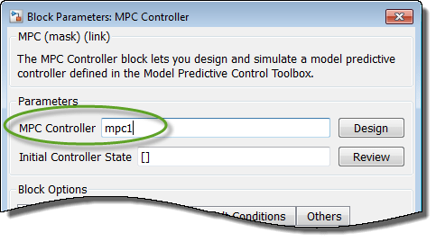 В диалоговом окне «Параметры блока» в поле «Контроллер MPC» укажите имя mpc из рабочей области MATLAB ®.