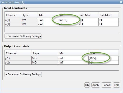 В MPC Designer можно задать изменяющиеся во времени ограничения. В диалоговом окне «Зависимости» задайте вектор для каждого изменяющегося во времени ограничения.
