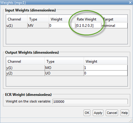 Как объясняется в разделе «Проблема оптимизации», веса wy, wu и w∆u могут изменяться от одного шага в горизонте прогнозирования к следующему. Такой изменяющийся во времени вес представляет собой массив, содержащий p строк, где p является горизонтом прогнозирования, и ny или nu столбцов (количество OV или MV).