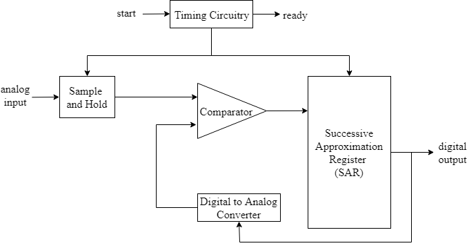 Выходной сигнал SAR подается обратно в DAC, выходной сигнал которого сравнивается с входным сигналом. Если выходной сигнал DAC больше, чем аналоговый вход, MSB сбрасывается, в противном случае он остается установленным. Следующий MSB теперь установлен в 1, и процесс повторяется до тех пор, пока не будет сравнен каждый бит SAR. Конечное значение SAR в конце этого процесса соответствует значению аналогового входа. Конец процесса преобразования обозначается сигналом готовности.