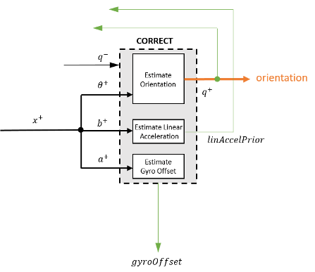 Уравнения Калмана используют оценку гравитации, полученную из показаний гироскопа, g, и наблюдения за процессом ошибок, z, для обновления матриц усиления Калмана и промежуточной ковариации. Коэффициент усиления Калмана применяется к сигналу ошибки z для вывода апостериорной оценки ошибки x +.